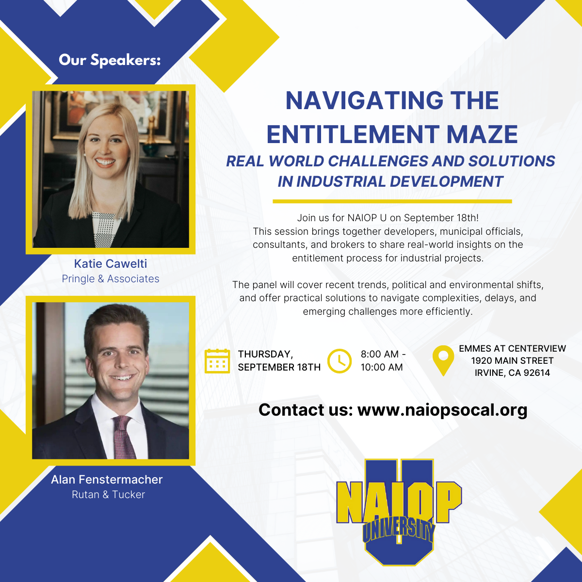 DESCRIPTION:Navigating the Entitlement MazeREAL WORLD CHALLENGES AND SOLUTIONS IN INDUSTRIAL DEVELOPMENT\nWhen: Thursday\, September 18\, 2025\nHosted by: EMMES AT CENTERVIEW1920 MAIN STREET  IRVINE\, CA 92614\nTime: 8:00 am - 10:00 am\nProvide developers\, municipal officials\, consultants\, and brokers with real-world insights into the complexities\, delays\, and emerging challenges in the entitlement process for industrial projects. The panel will explore recent trends\, political and environmental shifts\, and offer practical solutions to navigate the process more efficiently.